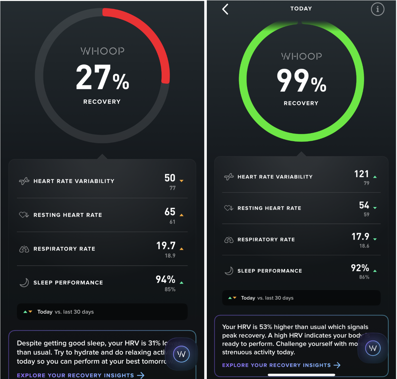 - What does the underlying data tell me, and how does that compare to my baseline? If my recovery score is low, but my individual data points (RHR, HRV, RR) are normal, then I'm not too worried. The biggest red flag is when HRV is down and resting heart rate and respiratory rate are up* - this is a signal that your body is under a lot of stress and is less able to make adaptations and less resilient to sickness and injury.